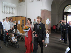 Novomanželům to moc slušelo - Tomáš měl sice k černému obleku hnědé boty (to nevím , kde na to došel), Ireniny červené šaty ale neměly chybu.