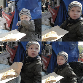 Studený jarní vítr nám pod nos podsouval rozličné vůně. Zakotvili jsme u stánku s blízkovýchodními specialitami. Já jsem si dala kávu z džezvy, Miky štrúdl, ten se prostě jí všude.