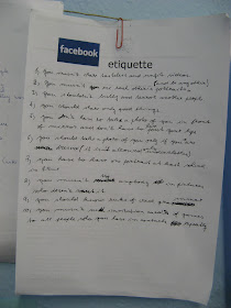 Měli jsme v pomaturitním téma mobilní telefony a modální slovesa have to, must, don´t have to, mustn´t, should a shouldn´t. Tak jsem to pro ně trošku updatovala a vytvářeli tzv. Facebook etiquette neboli pravidla chování na této sociální síti. Zdařilá akce.